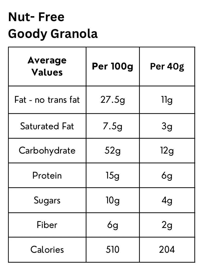 Each 40g serving of Goody Granola provides 15% protein, 4% iron, and 16% calcium of the recommended daily intake. Free from refined sugar and trans fats, our granola features only the best, tastiest ingredients for your health.