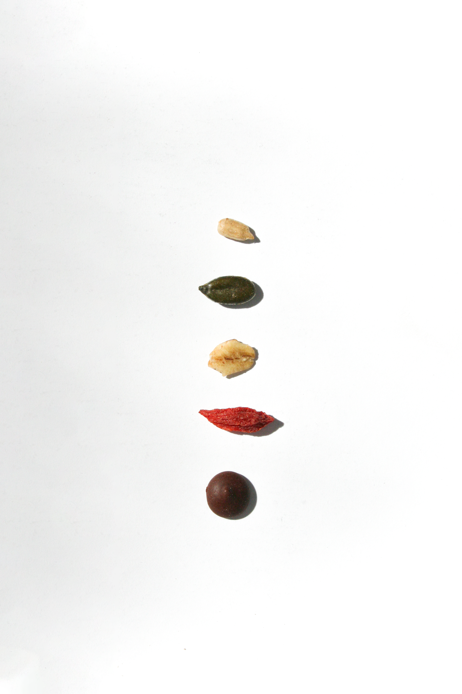 Oats, organic pumpkin seeds, organic sunflower seeds, Extra virgin olive oil, honey, dried goji berries and 70% Peruvian dark chocolate pieces